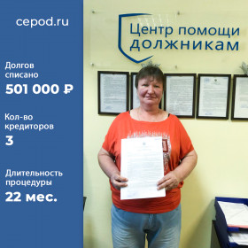 Списано долгов на 501 000 р. за 22 месяца. Кол-во кредиторов - 3 шт.